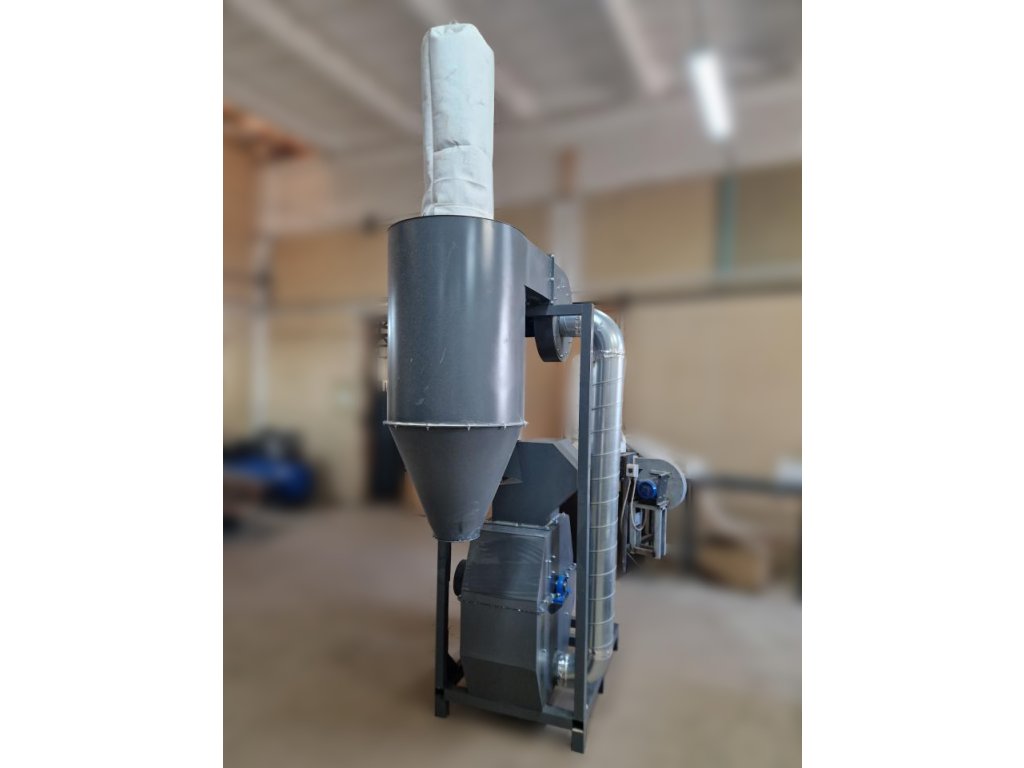 Odstředivé síly působící na drť během drcení ji ženou proti sítu. Velikosti otvorů v sítu určují, jak hrubozrnná bude vaše pomletá surovina. V našem drtiči je síto s otvory o průměru 5 mm. Můžeme dodat také síta s jinými průměry otvorů 4, 5, 6, 8 mm a taky čtvercové otvory, které jsou vhodné pro vysoký výkon u štěpky pro kotelny a zahradnictví. Hotovou drť odsává horní ventilátor do cyklonu. Z cyklonu pomletá drť – štěpka – šrot, ... padá do zásobníku.