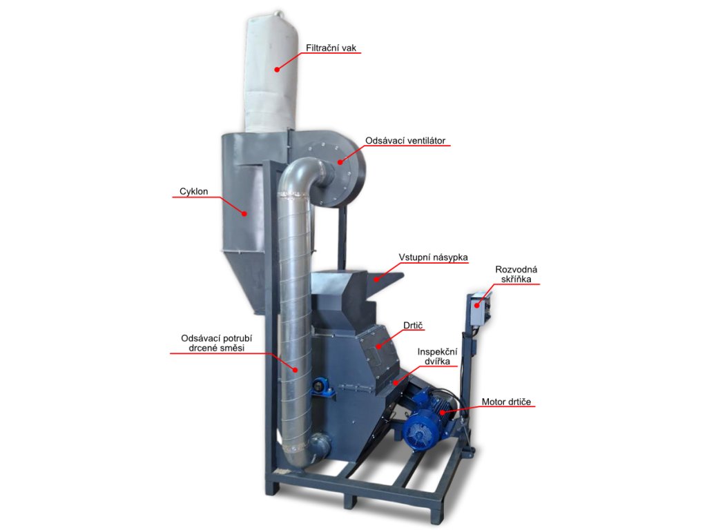 Předmětem dodávky je drtič dřevního odpadu s hl. motorem 7,5kW, odsávací zařízení s motorem 1,5kW, cyklon s filtračním pytlem, rozvodná krabice – vypínač hl. motoru, vypínač motoru odsávání, měření zatížení hlavního motoru, návod na obsluhu.