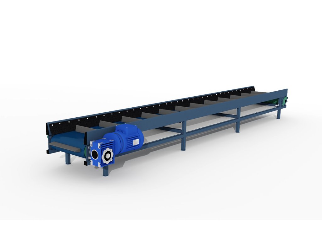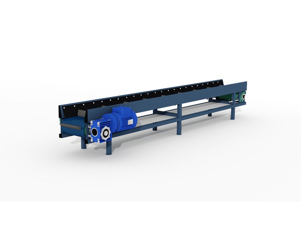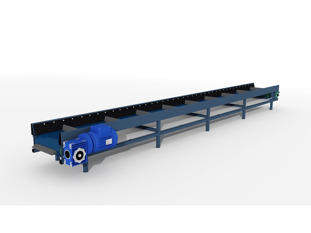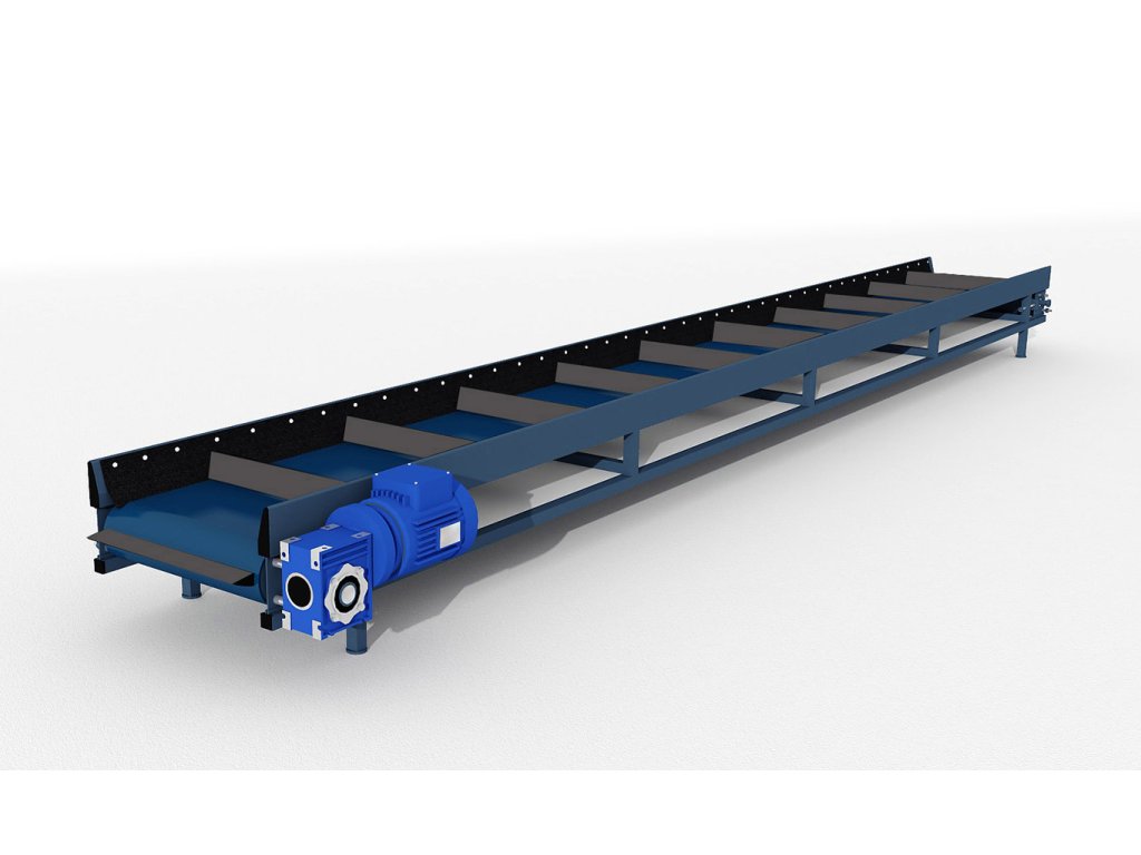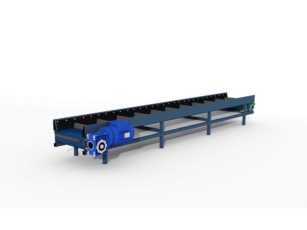 Pásový dopravník s unášeči s pevnými nožičkami. Délka od 2m, šíře od 20cm.