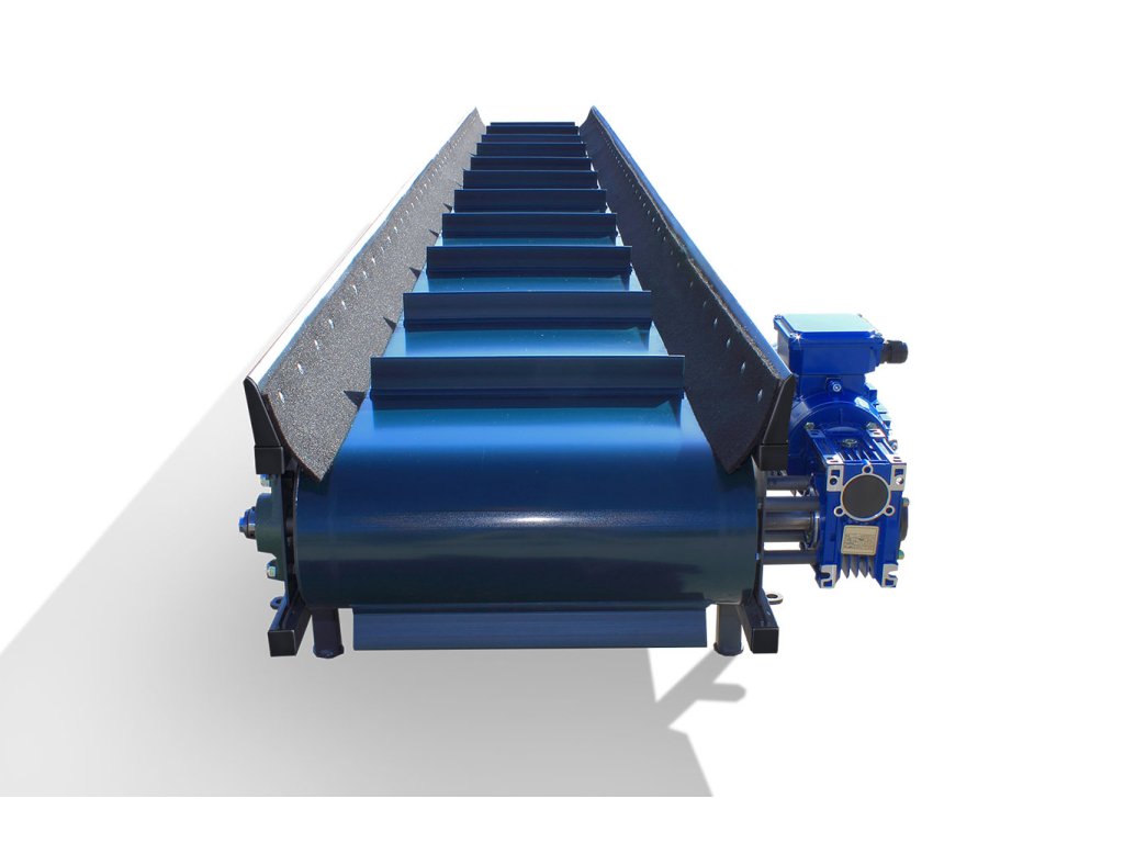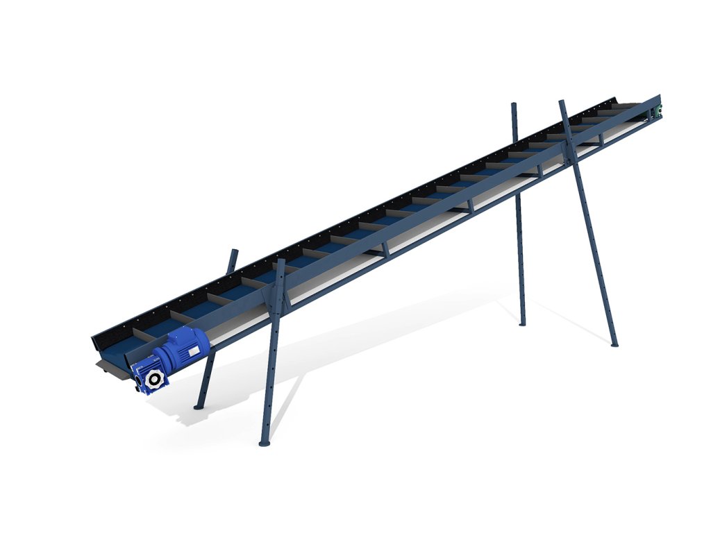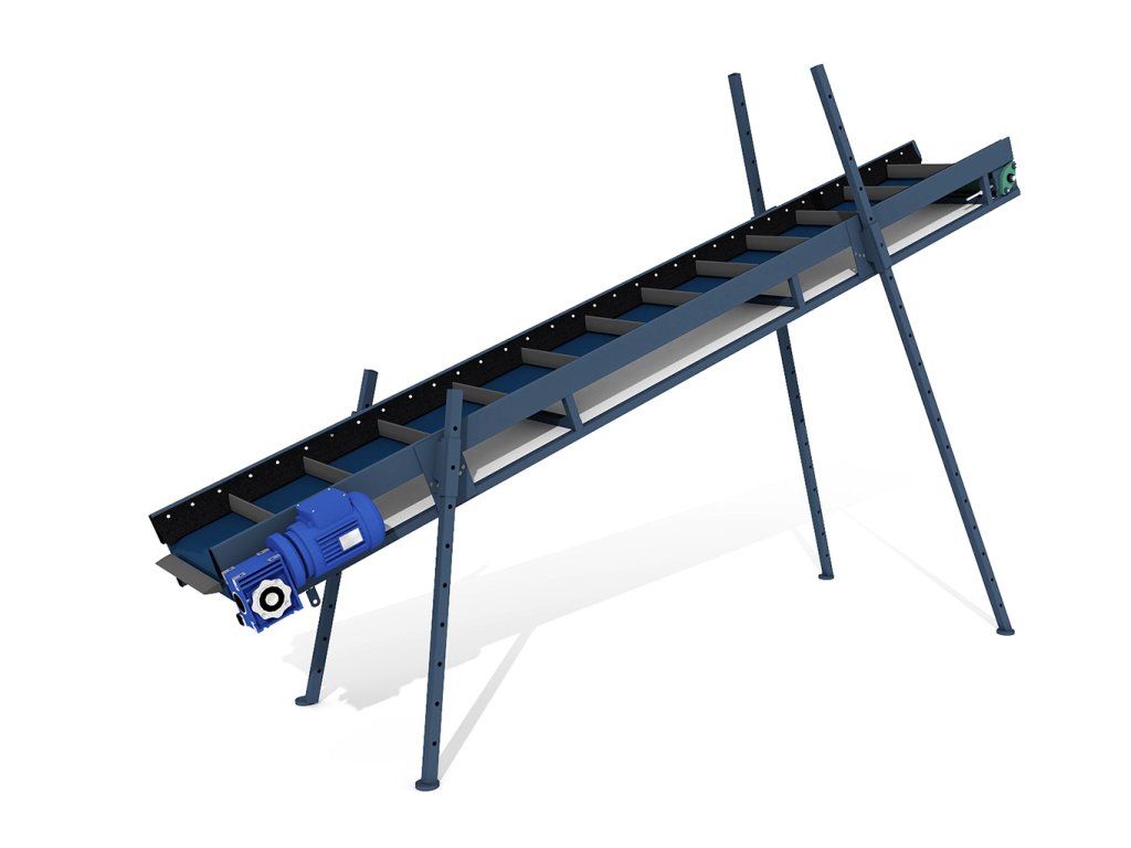 Pásový dopravník s unášeči a s možností nastavení výšky a naklopení pomocí výsuvných nožiček.